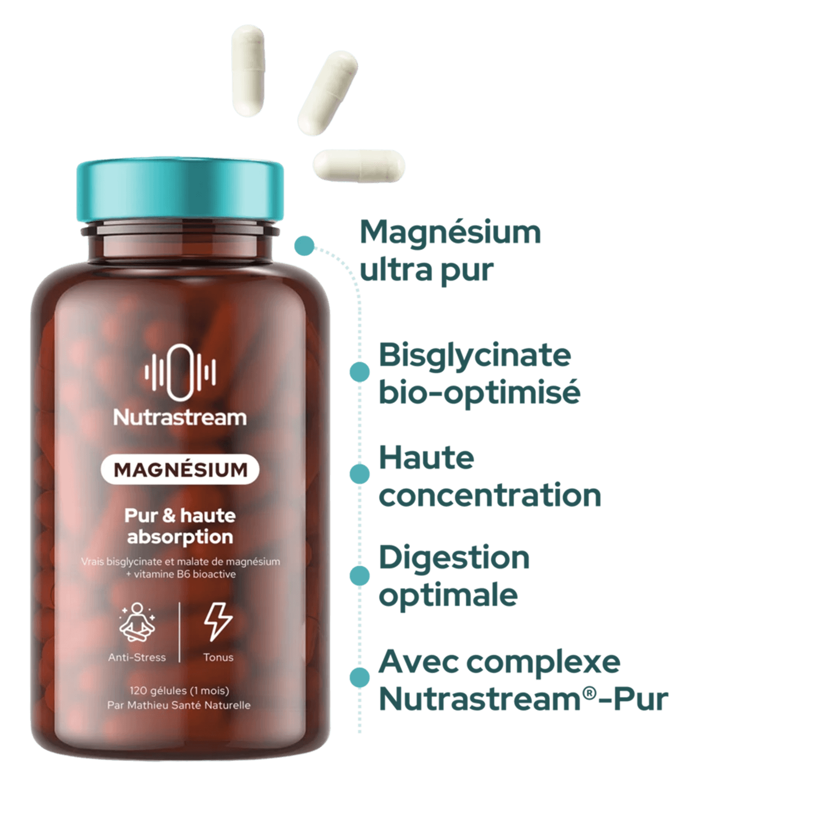 Votre magnésium Nutrastream, apportant le complexe exclusif Nutrastream®-Pur, associant bisglycinate et malate de magnésium purs, non tamponné (contrairement à beaucoup de marques qui “coupent” leurs produits avec des formes bas de gamme, et sans forcément vous le dire).